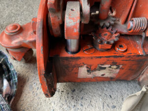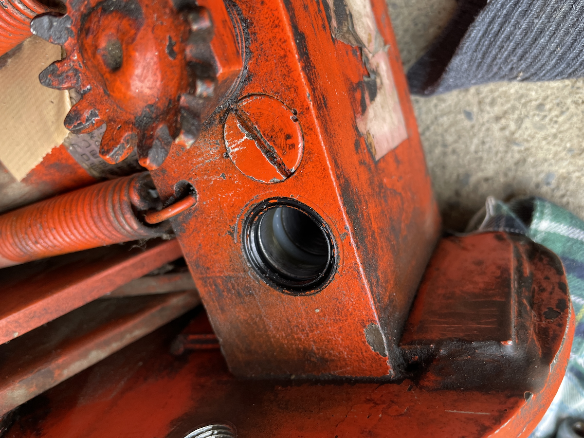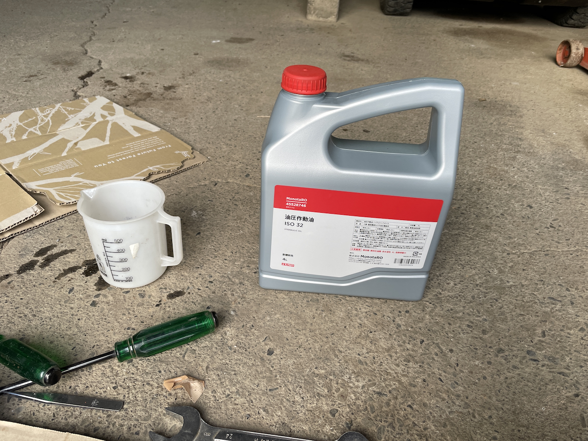 オイルを入れてみる。monotaroの油圧作動油を入れる。油圧用作動油という表記がどこかのページにあったのと、スキッドローダの油圧の補充に使ったのがあったので、これを使用。特に問題はないと思います、特に理由はないのですが。
