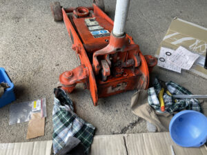 オイルを入れる時は、ジョウロを作って少しづづ入れるが入っていかないので、ピストンをシュポシュポすると空気が上がってくる、それを繰り返すと、300ml弱入った模様。注入口のキャップをして、実際に上げてみると漏れずに動いている。ふむ、治ったとみていいか。若干滲んでいるようだが、交換前は上がらずに溢れてたので進歩だろう、治ったと言っていいはず。