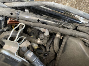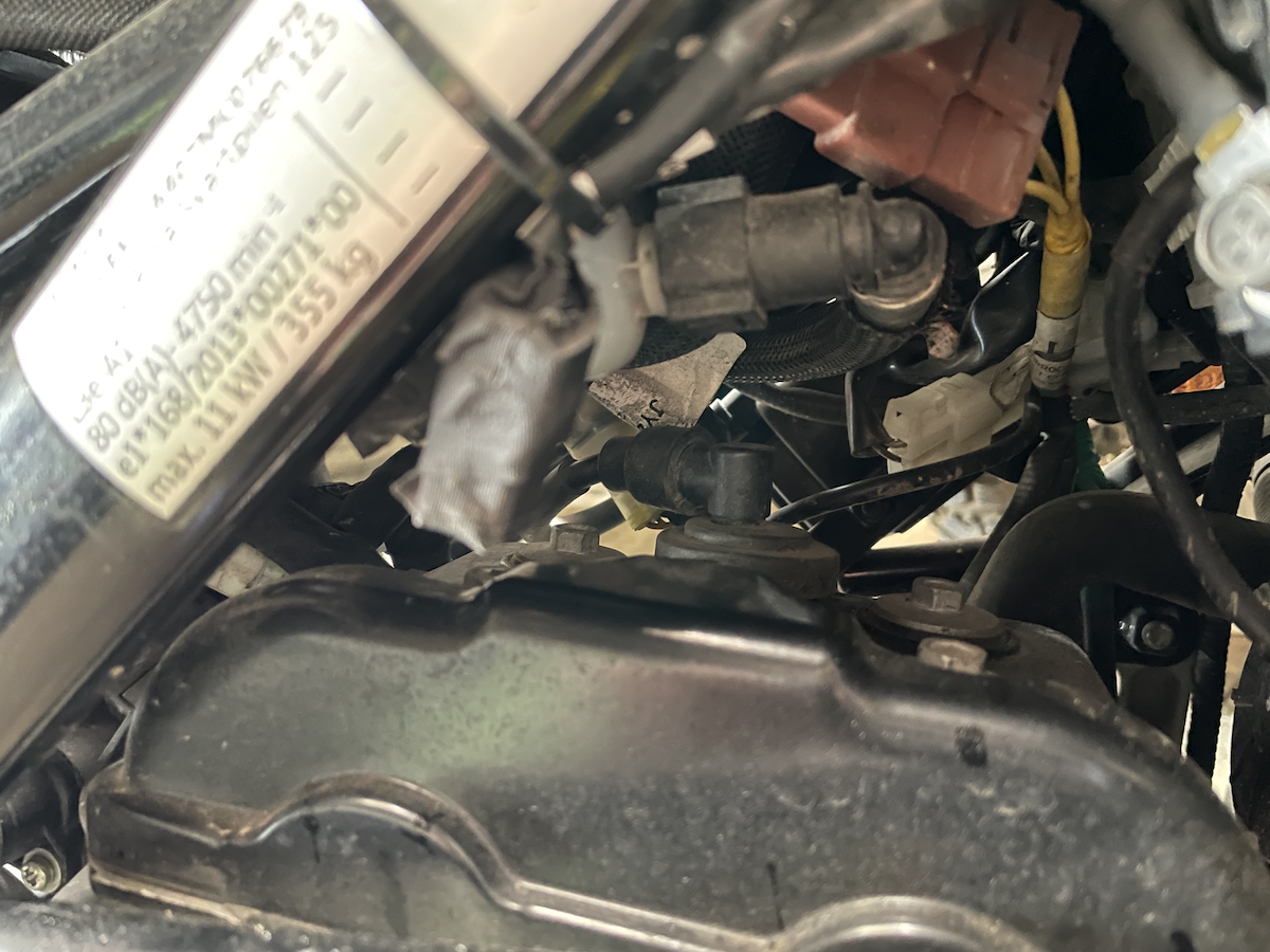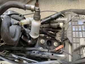 再度組み付けるが、上の写真にあるパイプが外れてた。タンクをずらすと外れてしまうんだが、一つは冷却水、もう一つは燃料のエア抜きっぽいね。片側にしかバンドがついてなかったが、両方あるべきだよね?