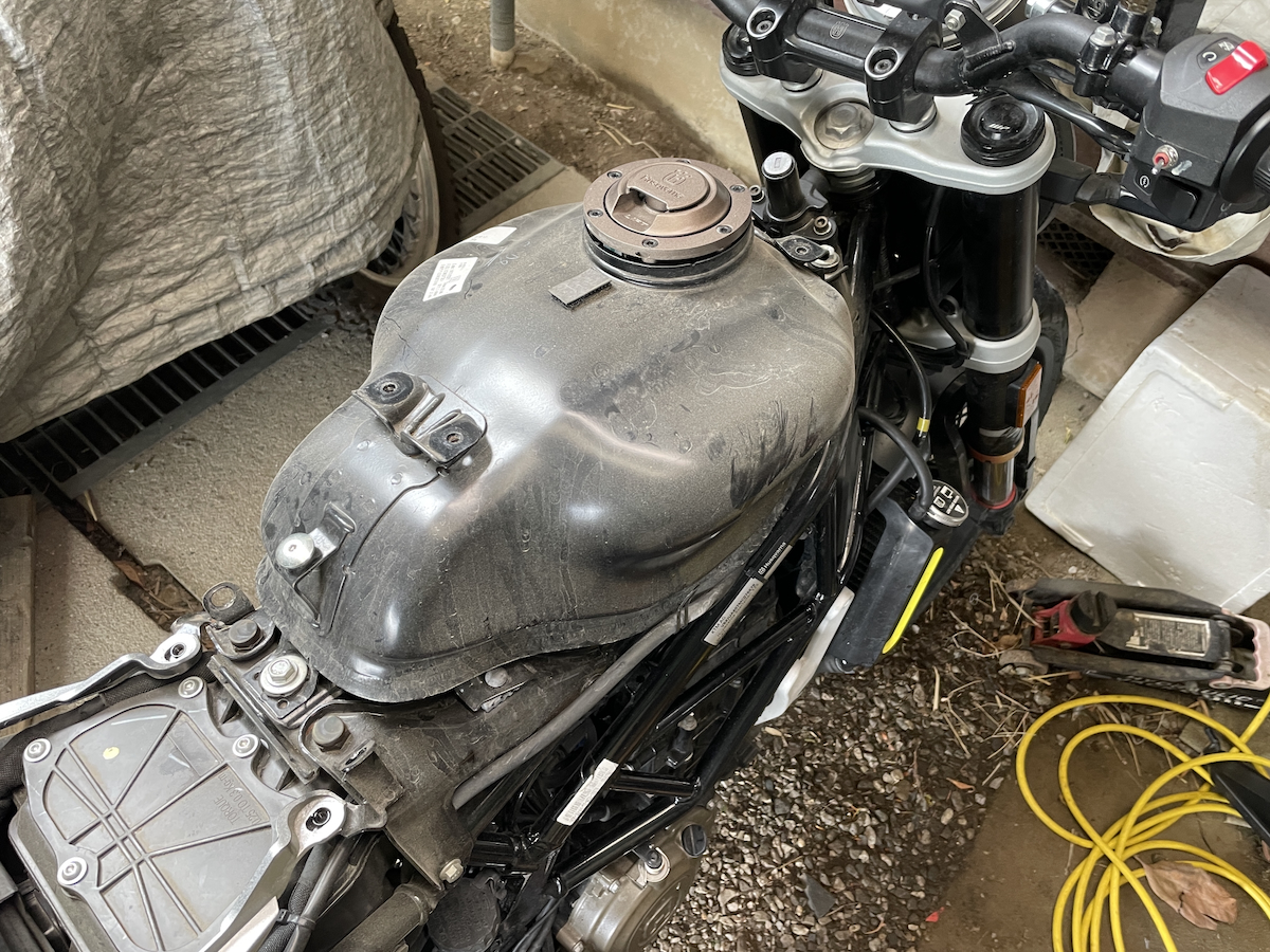 プラグキャップは見えているんだが、DOHC-4バルブで深いところにプラグがあるから、タンクをどけないと外せない