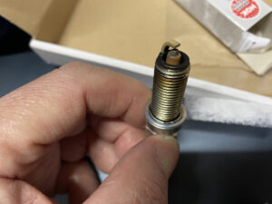 はずしたところ、プラグはススついてるけどそれほど悪い印象はないね。そんなことより、むちゃくちゃ硬くプラグが締め付けられてた。こいつは手で締め付けた後1/2回転するので、こんなにワッシャがぺちゃんこになるはずはないと思うんだが。しかも、純正ではなくNGKが付けられていたことから販売店で出荷整備で交換をしたのだろうと考えられる。