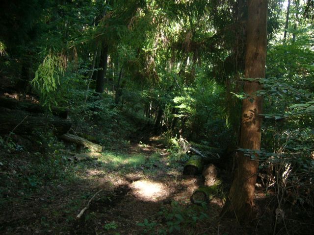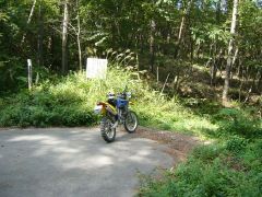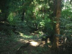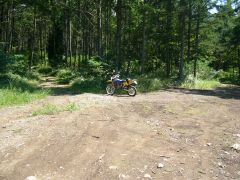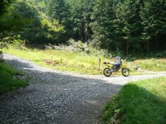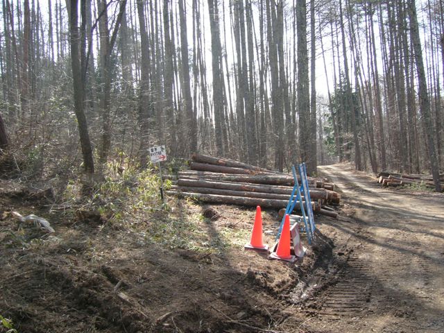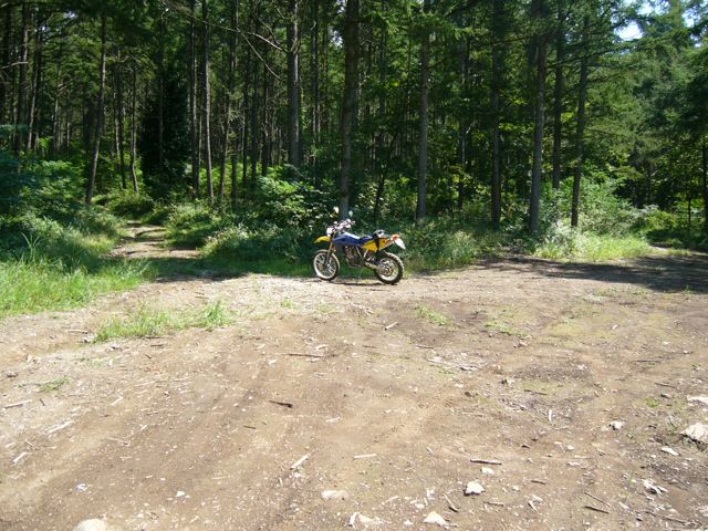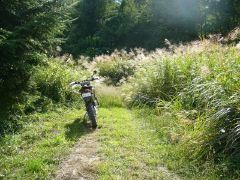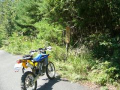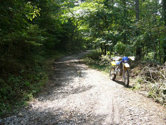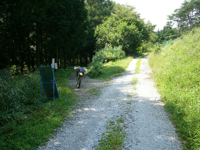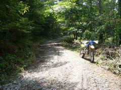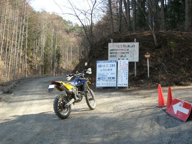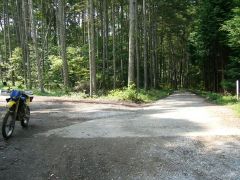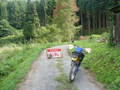分岐の左側。いったん上って下り始めると直ぐ判る、「きつい」林道です。我慢して下ると途中は薮こぎ状態になるが、舗装にでる事が出来る。最初からかなり荒れてんだけど峠になって今度は下ると、もっと荒れてる、最初下ったんだけど、表面は腐葉土でフカフカで、その下に黒土でヌタヌタ。その上、大きい石がごろごろ。しかもくねくね曲がっているんで、道も判んないんで下るまで、ずっとリアロック状態でした。が、感触的には上りもなんとか行けそうかなと思いました。その後、逆走してみたんですが、ちょい甘かったです。くねくねでスピードが乗らない上に、リアが跳ね上げられるので、すべっちゃって、悔しいのですが、まだ上がれてないです。いつかはリベンジと思っているのですが。。