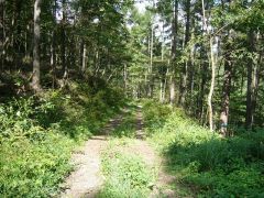 | 花岡山線の途中である。道幅はこの程度で、雨の後ではかなりえぐれている事もある。大きな石がでている箇所も有るので飛ばすときは注意が必要。 | 花岡山線を上った途中。広い道に鈍角にぶちあたる。写真の奥の方へ行くとゴルフ場の脇にでて舗装にでる。本線は写真の手前の方に進む。 |
