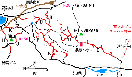 | G:女沢林道 | H:南峠?林道 | J:林道日影入線 |