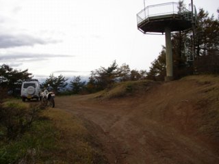 「へそ」の展望台からは、360度の絶景である(回り遮る物無いからね)。遠くは北アルプス、御岳、八ヶ岳、霧ヶ峰、南アルプス、など全部見渡せるでやんすよ。 写真のジムニーは、他人である。 このように車は、たまに来るのだが、バイクはここ数年、遭遇した事無い。
