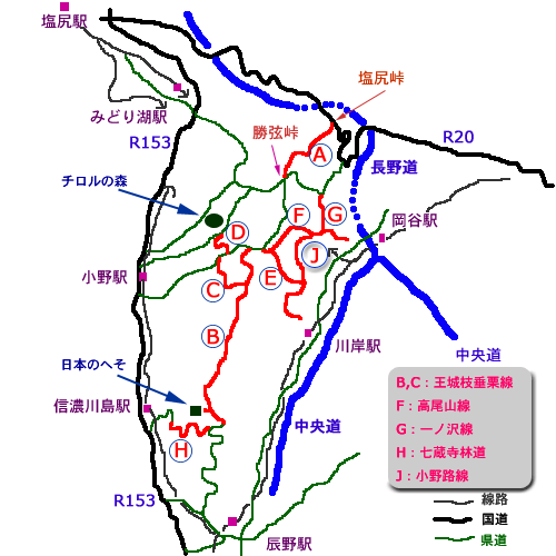 - 塩嶺峠(塩尻峠)〜勝弦(かっつる)峠の林道は、通行止めである。ゲートが開いている事もあるが、やめた方が良いだろう。ここには岡谷市の水源があるので、今の御時世にあらぬ詮索は無用だ。