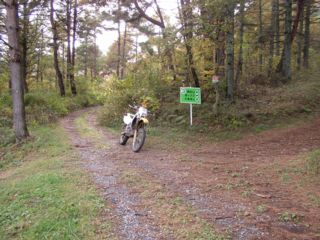 2つ目の分岐である。この分岐を下ると辰野側に出る事ができる。エスケープルートである。2〜3回走った事があるが、あんまりいかない。また戻ってこなきゃだめだから・・・通り抜けられるんだけど、いつも行きたい方向とは違う方になるので・・・・・ 写真のバイクの進行方向に対して左手(写真を見て右側)が尾根になっている。その向こうには岡谷(川岸か)がみえる。 ここから「へそ」まで約3.5kmである。 |