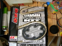 チェーンがスプロケットから一こま以上飛び出るぐらい伸びていたので、交換する事になった。チェーンCutterが壊れているので面倒、ということで、DRCの車種別スプロケットキットを試してみた。バラバラに買うよりほんのちょびっと安く、すでに車種用の長さでカットされている。