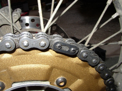DIDのXRINGチェーンのクリップ部である。クリップ部が特に強度的に弱くなっているのできれる時は必ずこの部分である。クリップの取り付け方向も重要である。写真の様に進行方向に足してクリップ口が後ろになるようにしなければならない。