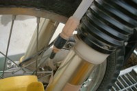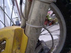 見た目美しくないできだが、確実である。オフでの走行ではホース自体が相当の振動を受けることが分かった。生半可な固定ではすぐにゆるんできてしまう。今後の課題である。