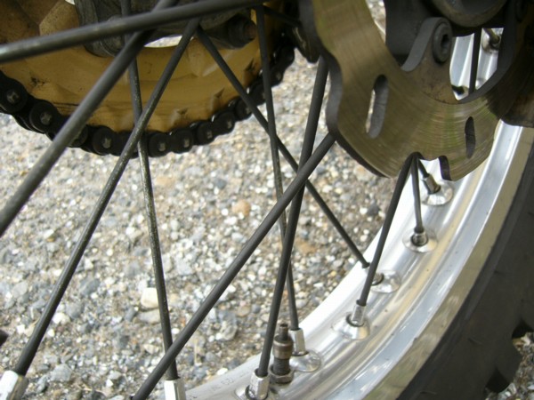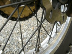 2007.4.21 効きは、いまもとてもいいのだが、ディスクプレートはかなり摩耗が進んでいます。さらに、メタルパッドの影響かな、粉塵がスポークやリムに直ぐ付着してしまって、こびりついててとれないです。かなりばっちー。