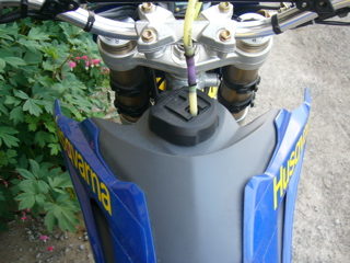 漏れない様に締めると王冠マークが横向いちゃうタンクキャップ。きちんと締めとかないと走行中にあふれてくるんですよ。 タンクはもちろん樹脂製。シュラウドやステッカーの立て付けが悪くはがれてきている。 |