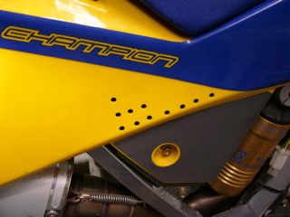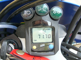 05モデルからエンジンは一新されたらしい。詳しい事わかんないんだけど、05からオイルポンプやバランサーが装着されているんだって。バランサーが入ってこの振動ってすごいよね。というかバランサーの有無って体感した事無いんで、想像だけど。推定60馬力(噂)で、120kgの車体、高いシート(178cmの僕でもつま先が届く程度)、暗いヘッドライト、強烈な振動ととってつけたような保安部品、そしてうるさい(かなり近所迷惑)。販売店の説明では、レギュレータが弱く(ものすごく小さいのが付いてる)、走っても充電しないので、たまに、充電器に掛けなければならない。見た事無いメーカの前後サスペンション。タイヤはミシュラン140/80のリアサイズ。ブロック間隔が広いが、公道可能、FIM公認タイヤというのね。走っていくうちに中央のブロックがどんどんもげてなくなっていく・・・・関西風に言うと「めっちゃちびる」。