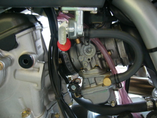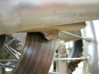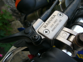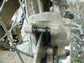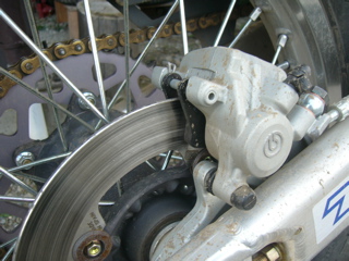 | 油圧クラッチ(MAGURA)思っていたほど操作性に変化無い。普通のワイヤ式と変わらない感触。ちょっとオイルが漏れているようである。その辺、細かい事が気になる人はこのバイクには乗れないってことでしょう。 | リアディスクはアナなし。排土性はどうなんだろうと思うのだが。接触面積は大きいので効きはすごそうである。 いや、実際、効きは最高である。 |
