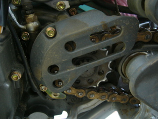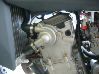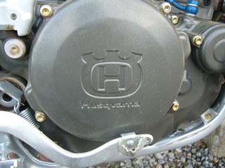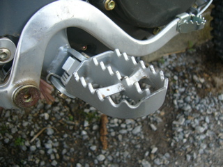 | ワイドフットペグ(鉄)スタンディングの時の安定性はやはり素人でもわかるね。ただ、取り回しの際や足付くときに足にひっかかるので煩わしい。 | クラッチカバーはマグネシウム。というか、シリンダとシリンダヘッド以外は全部マグネシウム。エンジン周りの締結にはM8ナットが多く使われているのだが。M8のレンチもっといいのカッとかないと、ちときついね。 |