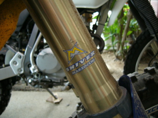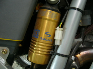 | フロントサスはマルゾッキ。SHIVERって書いてある。 | リアショックはSACHS。 |