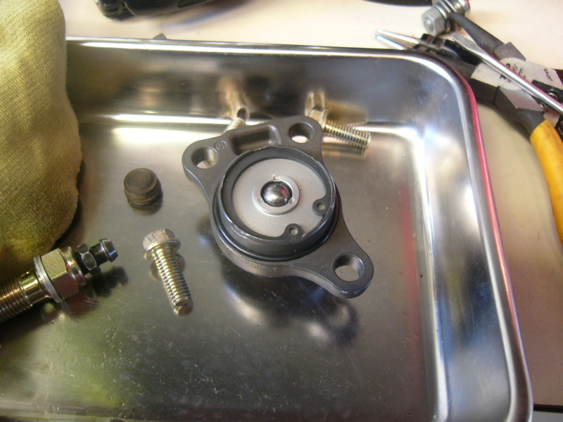 うーん、エアかんでるだけなんかなー。レバー操作でブリーダからオイルはニューと出てくるけど気泡は入っとらへん。だが、マスタシリンダからは小さい気泡がいつまでも出続ける。やっぱりエア噛んどるんかいなぁ。
