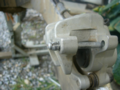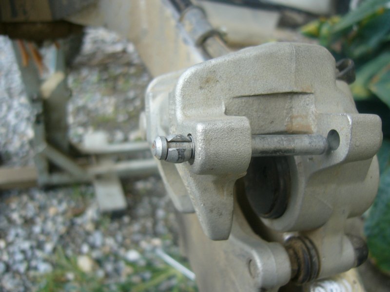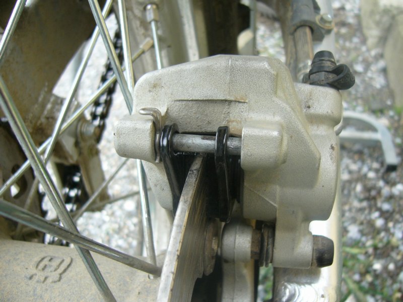 錆びているのは、しばらく乗っていなかったためです。Discロータはまだ十分な厚さがありました。HusqのパッドはPinがこのクリップだけで留まっていて整備性が良いように見えました。 このPinは圧入されていまして、反対側から細い棒とハンマーで押し出してやる必要があります。 写真をクリックすると判るように、DRとかXRのPAD交換しかした事が無かった私には、少々手こずりました。Pinがなかなか抜けなかったんです。例によって、Pinを外せばPADは落ちるのだが、pinが圧入されていて(ピンの根元に金属の輪っかが付いていてくるくるまわる)それを押し出してやる必要があります。それを今回は六角レンチの細いのを刺してハンマーでぶっ叩きましたが、正道でしょうか?車載工具には何も無かったぞ。