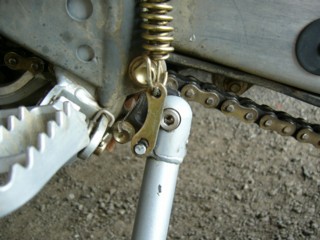 こいつのサイドスタンドは純正では跳ね上げ式(バイクをたてるとスタンドが勝手に跳ね上がる。スタンドはバイクの重みで地面に押し付けられて固定される方式)なのだが、販売店で勝手に跳ね上がらないように、跳ね上げねじを交換している。