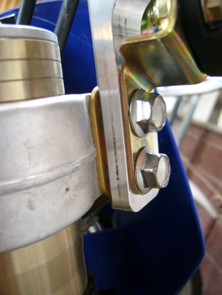 左はMAGURAの油圧ホースの根元が干渉。これでもめいっぱいグリップ部に寄せているのに干渉する。右はブレーキホースに干渉する。しかたがないので、ハンドル固定部を上下逆に付けて干渉部をネジのぎりぎりまで45度の角度で削りを入れた。(上下逆にしないとネジ固定できない)。それでも写真の様に干渉している。