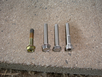 上の写真のネジは左端が純正で、ステーが厚み9mmの為+10mmのもを探した。右端の2本はホームセンターで手に入る。M6ヘキサか13mmのインチ頭。特殊な工具はやだから、ネットで右から3番目のフラジボルトを購入、¥85@本。少々高いがステンで手を打つ。本当は右端の半ネジと呼ばれる物が欲しいのだが、これはネットを探しまくっても出てこなかった。DRCでも扱ってるんだが、45mmまでしか無く、今回は50mmだったのであきらめた。