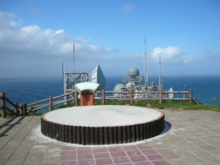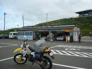 | 岬の方を向いてみると、以前あった建物がない。無人化されたためだと思う。また岬先端にあるアンテナ類は有刺鉄線が張り巡らされ、以前と様子が全く違う。 | 龍飛崎灯台に下にある駐車場の売店。みやげはいつもここで買う。干したタコは真ん中の店にはない。ステッカー類は、右の店にない。こういったところでは、両方の店から買うようにいつも心がけている。左端の店は、今日はしまっていた。左端の店は以前はたこのおでんを売って試食させてくれたんだが残念。 |