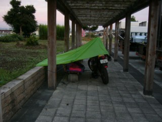 満腹になったところで、ガソリンも満腹にして道の駅でくつろいでたら、動きたくなくなり、軒下にテントを張って寝ました。夜は激しい風雨で、ばたばたばたばた、30分おきに目が覚め、あまり熟睡できなかった。
