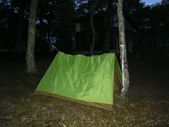 「バンガローがありましたよね?」「去年取り壊しちゃったんですよ。」「はぁ」なんとなく、そんな予感はしたよ(いつもそこにそれがあるとは限らない・・・)。こういうこと結構多い。テントをひもで引っ張りながらベグを打ち、その上にフライをかけて完成である。雨露はしのげるだろう。