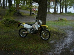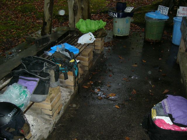 | 雨の中、、、出発直前。良いバイクだ、よくはしる。 | 雨の中、炊事場に逃げこむの図。既に濡れている。 |