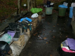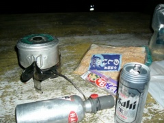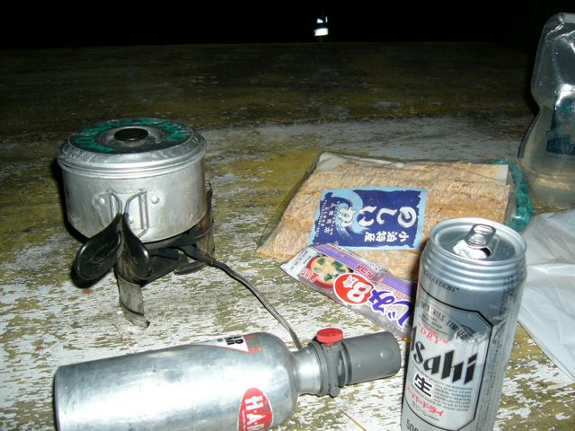 朝3時頃から降り始め、7時頃には相当激しくなってきた。きちんとフライが張られてないので、入り口付近は決壊寸前である。とりあえず、荷物を持って炊事場に逃げ込むが横殴りの雨で効果無しである。ポールがないとテントがうまくたためず点とは中も外も水浸しである。とりあえず、昨日かっておいた、やきそばバゴーンを作って食べ、コーヒ飲んで一休み。カッパは防水スプレーをかけてきたけど30分持たなかったなぁ。役に立たんと思たけど、やっぱり役に立たんかった。
