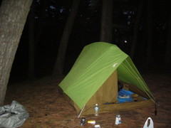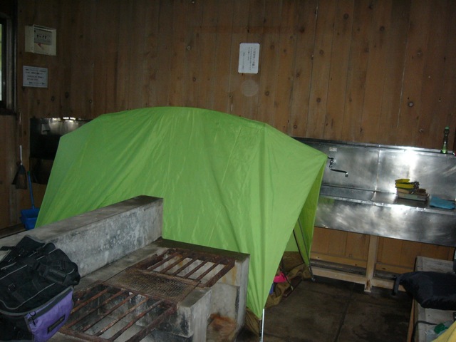 夜中、2時頃、テントのバタバタ音がうるさい。とてもうるさい。どうも風が海風(西からの風)に変わった模様だ。かなり風がきつそう。ちょっと我慢してたが、3時頃ばたばたと大粒の雨が降って来て、おまけに、テントに寝てるのにテントごと持ち上げられる感じ、ごろんごろんして寝てられん。このままだと、アメリカまで飛ばされるかも知れん。