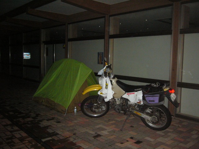 で、ふたたび、国道に出て南下。おじさんに出会う恐れが会ったが、道の駅「てんのう」に到着。ここは温泉が有る。温泉は22時までだ。おじさんが居ない事を確認して、温泉に入り、周りが暗くなった所で軒下に設営させていただいた。もちろん、明るくなる5時には畳む。夜中、なんどか雨が降ったので、軒下で良かった。