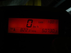 自宅に到着。Trip Aは出発時に0にした。999.9までしか表示できないので、1822kmの全走行距離でございます。 オドは50730kmとなっているが、このメータを付けてない時がかなり有ったので、たぶん8万ぐらいは来ているのではないか、、と。 |
