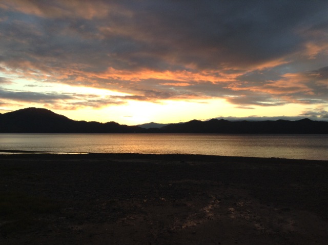 もうちょっとで夕陽になるなってときで、しかも西の方だけ晴れてる!。設営中、中学生のキャーキャー騒ぎにぼーっとしてたら、うっかり田沢湖に沈む(と言っても山にですが)夕日を見損ないました。夕日の時だけ晴れたのでした。夕陽が出たら明日は晴れじゃないですか?。台風消失したんだ。と呑気に考えておりました。