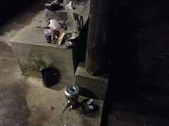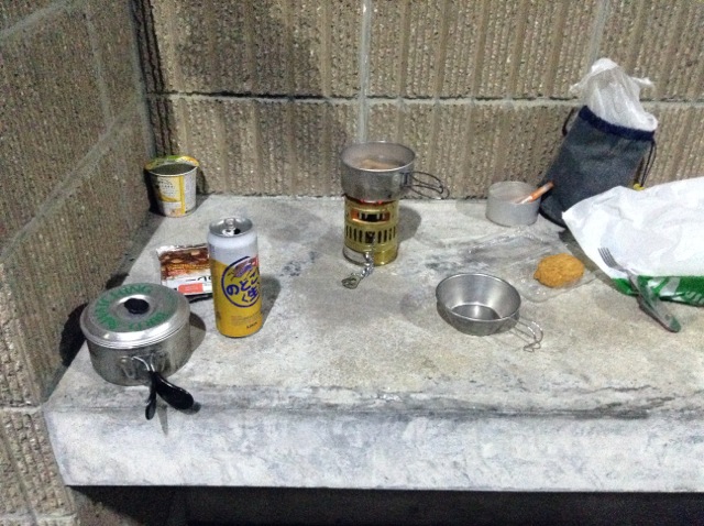 田沢湖の沈む夕陽(じつはもう沈んじゃってる)田沢湖キャンプ場は湖畔にあります。岸から県道挟んですぐ。なーんも無い所なんだが、毎回来たくなる。 | 炊事場の明かりで飯を炊く。今夜もレトルト。つまみはホタテ干したの、道の駅で買った。 |