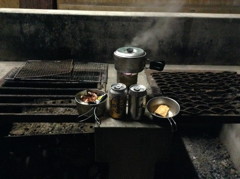 | 西浜キャンプ場の夕飯。ほんとはホタテのはずだったんだけど、毎度のレトルト。 |