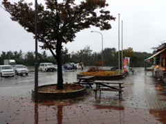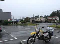 | 西浜キャンプ場の朝。地面は砂を多く含んだ土。600円と安いのだが施設等は充実しているのですよ。しかも広い。 | 近くのコンビにサンクス。wi2で台風情報を。カッパ来て軒下に座り込んでる私はかなり変な人です。しかも平日ですから。 | 北陸道、米山SA。雨は結構激しい。ここでバイクのおばちゃんに遭遇。お姉ちゃん?いや、俺より下とは思うがおばちゃんや。山形から上越に向かうらしい。 |