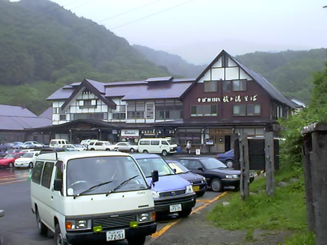 弘前からR102〜R394で、八甲田山のふもとに酸ヶ湯温泉「千人風呂」へ向かう。山の途中で降り出してきた。写真は酸ヶ湯温泉「千人風呂」の駐車場である。御存じのように巨大な風呂で混浴である。 |