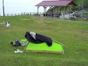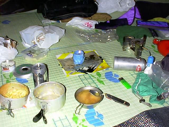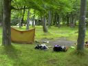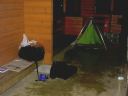 飯をくっていたら、雨がさらに激しくなってきた。気がついたら、テントの外の食器が浮いていると思ったら、すでにテントのなかはWaterベッド(しかもかなり高級の)であった。ぼくはグランドシートを持たない主義なのですぐに浸水した。床上浸水100mmである。これはかなりの被害である。これは移動するしか無いと思いカッパを着て外にとにだした。しかしキャンプ場は巨大な溜め池となっていた。