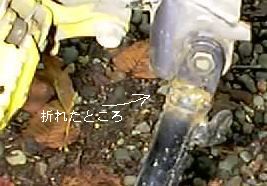 戻り初めて、数キロ。十和田湖町の外れ。売店の前でバイクをとめて降りたら、バイクが勝手に倒れた。「グシャ。あれ、スタンドだし忘れたっヶ」おこしてみると、スタンドが根元から折れていた。事件発生!