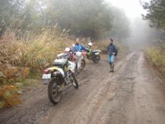 2)霧雨になる。9:30塩尻峠を出発、峠から勝弦峠へゲートありダートを進む。勝弦から岡谷へ少し下って林道王城線へ入る。みちなりに進むと、王城パークウェイに出る。そこからすぐ左のダートに入り、辰野のへそに向かう。へそを通過し、鋪装工事がのびてきているが、七蔵寺林道で七蔵寺へ抜ける(下りの右カーブはやっぱり苦手である)。辰野のモンマートで休憩入れる。