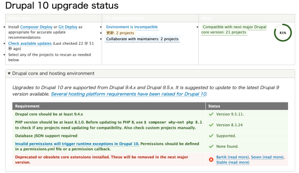 テーマが非互換、ということなのだが、Bartikはもともと純正テーマだったわけで、D7時代にmayoというテーマを使っていたものを苦労してこれに対応したというのに、非互換になるというのはどういうことよ!。と言いたいところ。仕方なく、テーマを探したらTARAというのに行き着いている。表示がしっくりこない部分も多々あるが、一旦10に対応しているので、これで移行作業を行うということで良いだろうか。Oliveroが純正テーマになっているらしいが、しっくりこなさ感が半端ないので、諦める。
