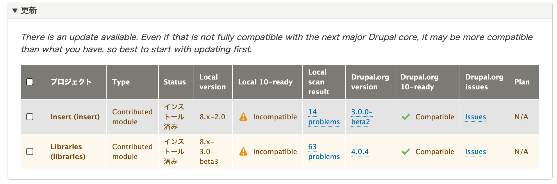 upgradestatus、利用可能なアップデートのどちらにも出てこないようになったが、機能拡張のページには出てくる。