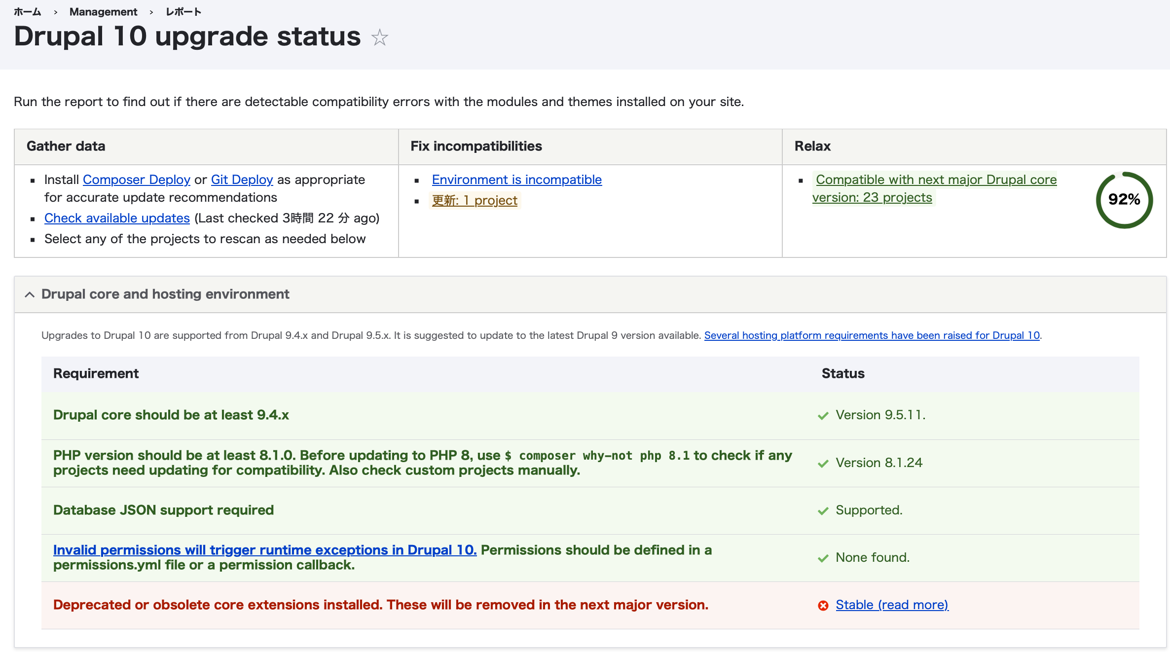上記の例では、すでにテーマで未対応のものも削除したので、%が上がっている。サイト上で、不要のテーマをアンインストールしても、ずっと残ったままになるので、composerでremoveすると、サイト上でも消える。
