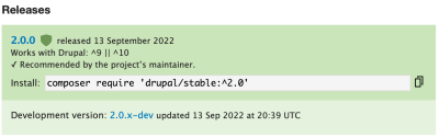 $ composer require 'drupal/stable:^2.0' ./composer.json has been updated Running composer update drupal/stable Loading composer repositories with package information Updating dependencies Lock file operations: 1 install, 0 updates, 0 removals - Locking drupal/stable (2.0.0) Writing lock file Installing dependencies from lock file (including require-dev) Package operations: 1 install, 0 updates, 0 removals - Downloading drupal/stable (2.0.0) - Installing drupal/stable (2.0.0): Extracting archive Generating autoload files Hardening vendor directory with .htaccess and web.config files. 90 packages you are using are looking for funding. Use the `composer fund` command to find out more! phpstan/extension-installer: Extensions installed Cleaning vendor directory. No security vulnerability advisories found.