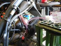 - オイルポンプのホースを取り外し、2stオイルを内部に満たす(といっても、黒くて中が見えないからU字にして入れる方を少し高くして、上から適当にトボトボ入れて他方から出て来たらそれをオイルポンプに刺す。