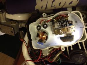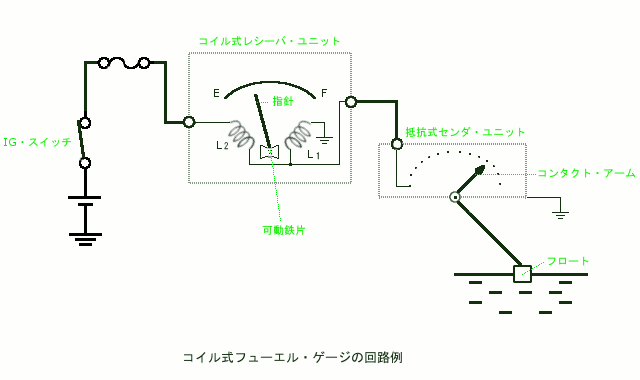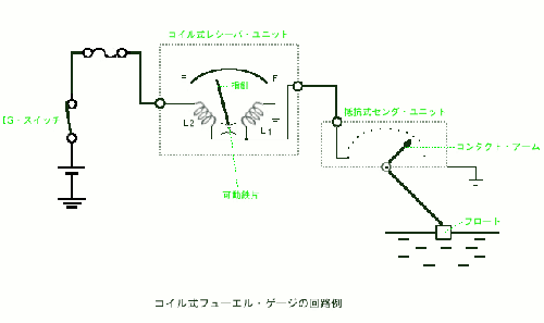 このお団子は何なのでしょうか?燃料タンクに浮いているフロートが上下することで、可変抵抗器が変化し、それを両端がコイルになっているメータで表示しているという事らしい。この絵、(http://www.engineer314.com/senmon/densoukairozu.html)