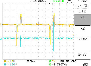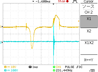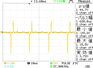グランドはバッテリのー端子で取得している。最初のピークが負であるので、充電後サイリスタで一気に放電(サイリスタはコンデンサの手前にある)回路のため。放電波形により振動後、2回目ぐらいで大きなスパイクはセカンダリの放電(スパーク)ではないかと思う。少々ピークが大きく、ここから信号を取り出すのは得策ではないように思える。