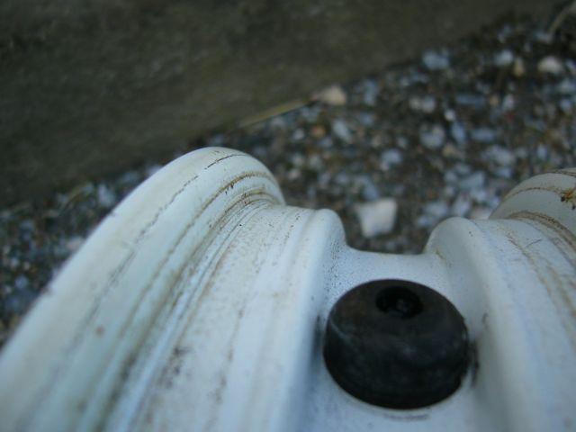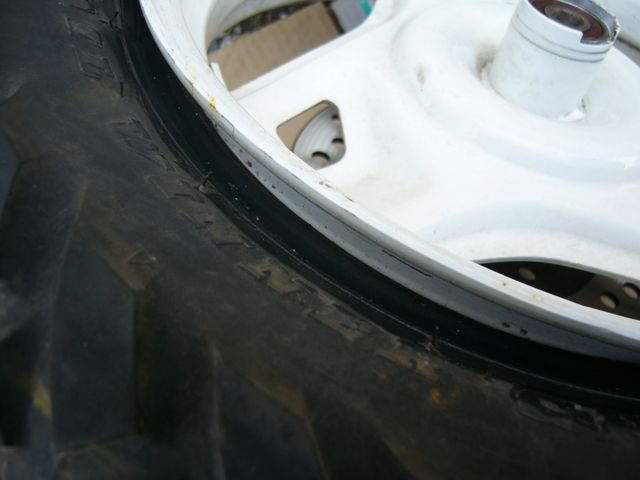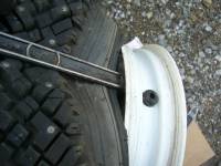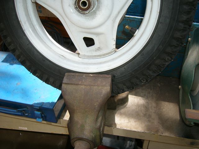 チューブレスタイヤのリムは写真の様にビードがはまる部分に段差(こぶ)があり、チューブタイヤのように足で力任せにやったってスクータごときでも外れません。そこで、万力(まんりき)を使います。