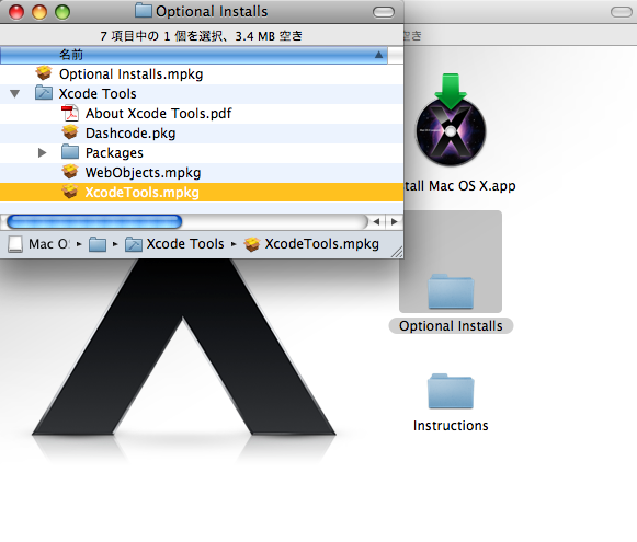 この中の「Optional Installs」フォルダから「Xcode Tools」フォルダを開き、XcodeTooks.mpkgファイルを実行するとインストーラが表示されます。特に設定もなく画面に従ってインストールをします。容量が大きく、かなりのDisk容量(3GBぐらい)と時間(1時間ぐらい)がかかりました。@PowerBookG4(867MHz)